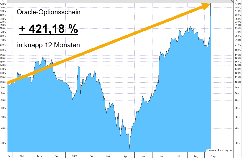 Zum Beispiel mit diesem Optionsschein auf Oracle. Hier verzeichneten wir innerhalb von knapp 12 Monaten einen Gewinn von sage und schreibe + 421,18 %.