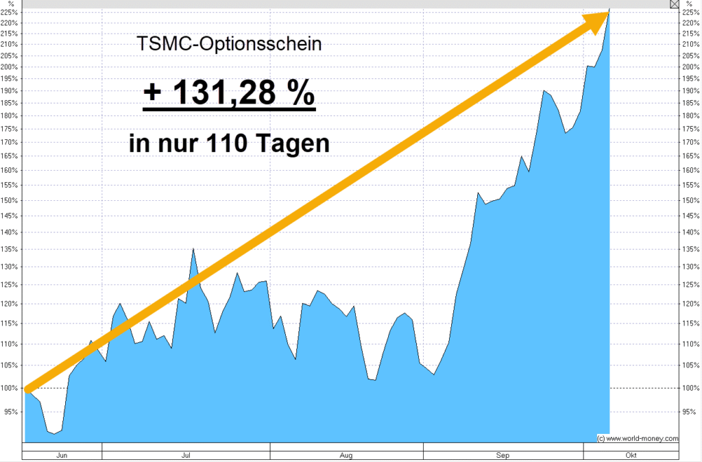 Auch der Chip-Produzent TSMC brachte uns einen ansehnlichen Gewinn ein. Nach 110 Tagen – also nicht einmal 4 Monaten – standen mit diesem Optionsschein