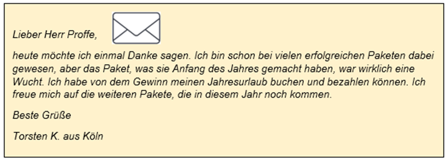 Überzeugen Sie sich selbst, wie meine Leser in kurzer Zeit satte Gewinne realisieren konnten:
