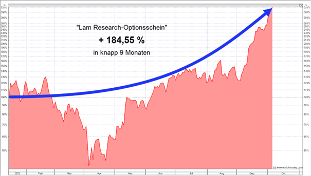 Dieser Optionsschein war im „Optionsschein Paket Chip Technology 2025 I“, also gekauft im Januar 2025. Der Lam Research Optionsschein macht fast eine Verdreifachung in nur 9 Monaten. Das sind die Geschwindigkeiten, die nun Realität werden.